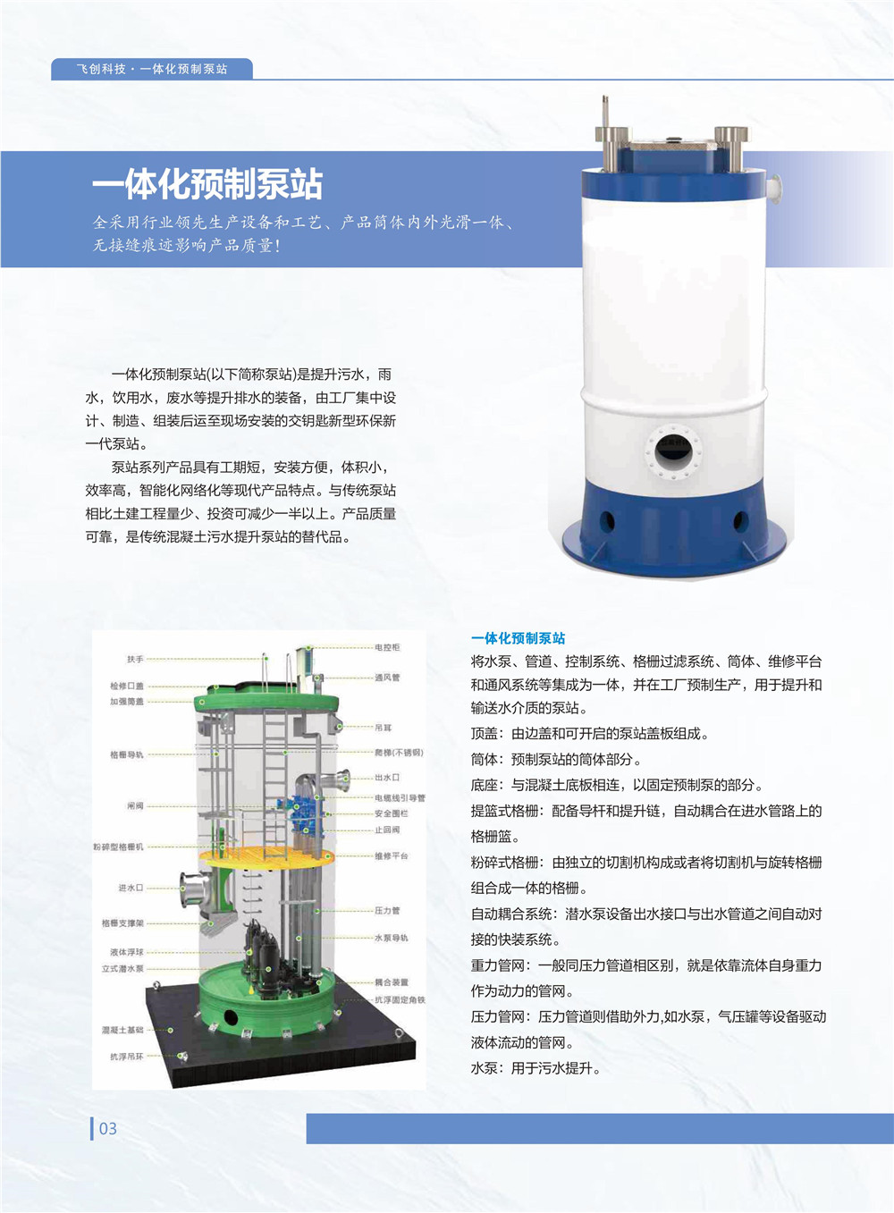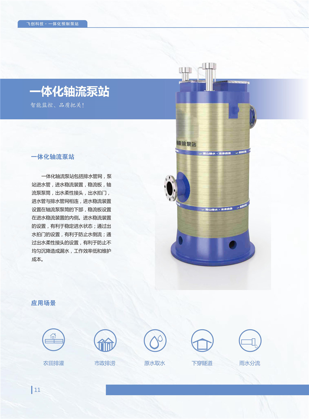 智能一體化泵站,適用于飲用水、污水、雨水、廢水泵排等應(yīng)用場(chǎng)景。泵站產(chǎn)品具有工期短,易安裝,體積小,效率高,壽命長(zhǎng),智能化網(wǎng)絡(luò)化等現(xiàn)代產(chǎn)品特點(diǎn),相比傳統(tǒng)泵站系統(tǒng),土方量少,可節(jié)省一半以上投資。