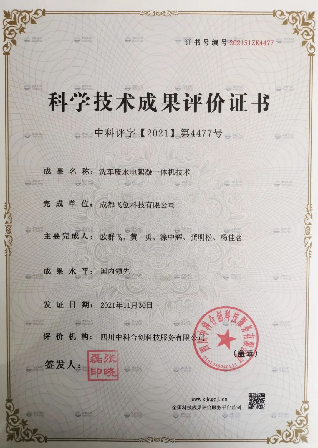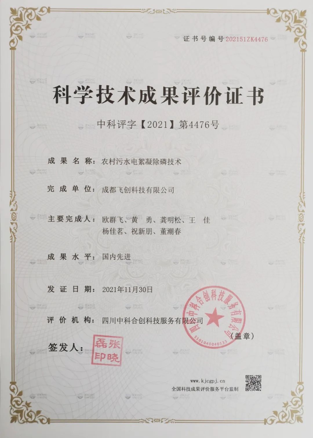祝賀飛創(chuàng)科技“農(nóng)村污水電絮凝除磷技術(shù)”藝獲得“國內(nèi)先進(jìn)”水平