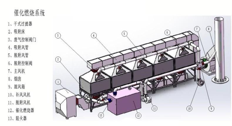 固定床沸石分子篩吸附+后處理裝置(冷凍冷疑法、RTO、RCO、CO 等)由廢氣預(yù)處理系統(tǒng)、固定床房石分子篩吸附系統(tǒng)、脫的系 統(tǒng)、干燥降溫系統(tǒng)、后處理系統(tǒng)(冷凍冷凝、RTO、RCO、CO等)和自動(dòng)控制系統(tǒng)等組成。