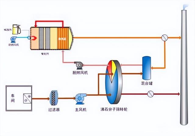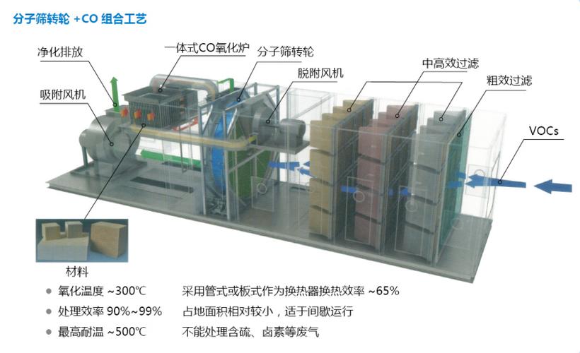 VOCs 的種類繁多、成分復(fù)雜、性質(zhì)各異,在很多情況下采用一種凈化技術(shù)往往難以達(dá)到治理要求,而且也不經(jīng)濟(jì),在處理大風(fēng)量、低濃度的廢氣燃燒和回收的時(shí)候,如果沒有沸石轉(zhuǎn)輪,直接進(jìn)行燃燒的情況下,廢氣處理設(shè)備不僅體和龐大,而且產(chǎn)生的運(yùn)行費(fèi)用也會(huì)很龐大,因此,在有機(jī)廢氣治理中,采用兩種或多種凈化技術(shù)的組合工藝近年來得到了迅速發(fā)展,沸石轉(zhuǎn)輪吸附濃縮技術(shù)就是針對(duì)低濃度VOCs 的治理而發(fā)展起來的一種新技術(shù),與焚燒技術(shù)(催化燃燒或高溫焚燒)或冷凝技術(shù)進(jìn)行組合,形成了滿石轉(zhuǎn)輪吸附濃縮+焚境技術(shù)”和“沸石轉(zhuǎn)輪吸附濃縮+冷凝回收技術(shù)”。沸石轉(zhuǎn)輪是將大風(fēng)量、低濃度的廢氣濃縮到高濃度、小風(fēng)量的廢氣,從而減少設(shè)備的投入費(fèi)用和運(yùn)行成本,提高VOCs廢氣的高效率處理。利用不同單元治理技術(shù)的優(yōu)勢(shì),采用組合治理工藝,不僅可以滿足排放要求,而且可以降低凈化設(shè)備的運(yùn)行費(fèi)用。
