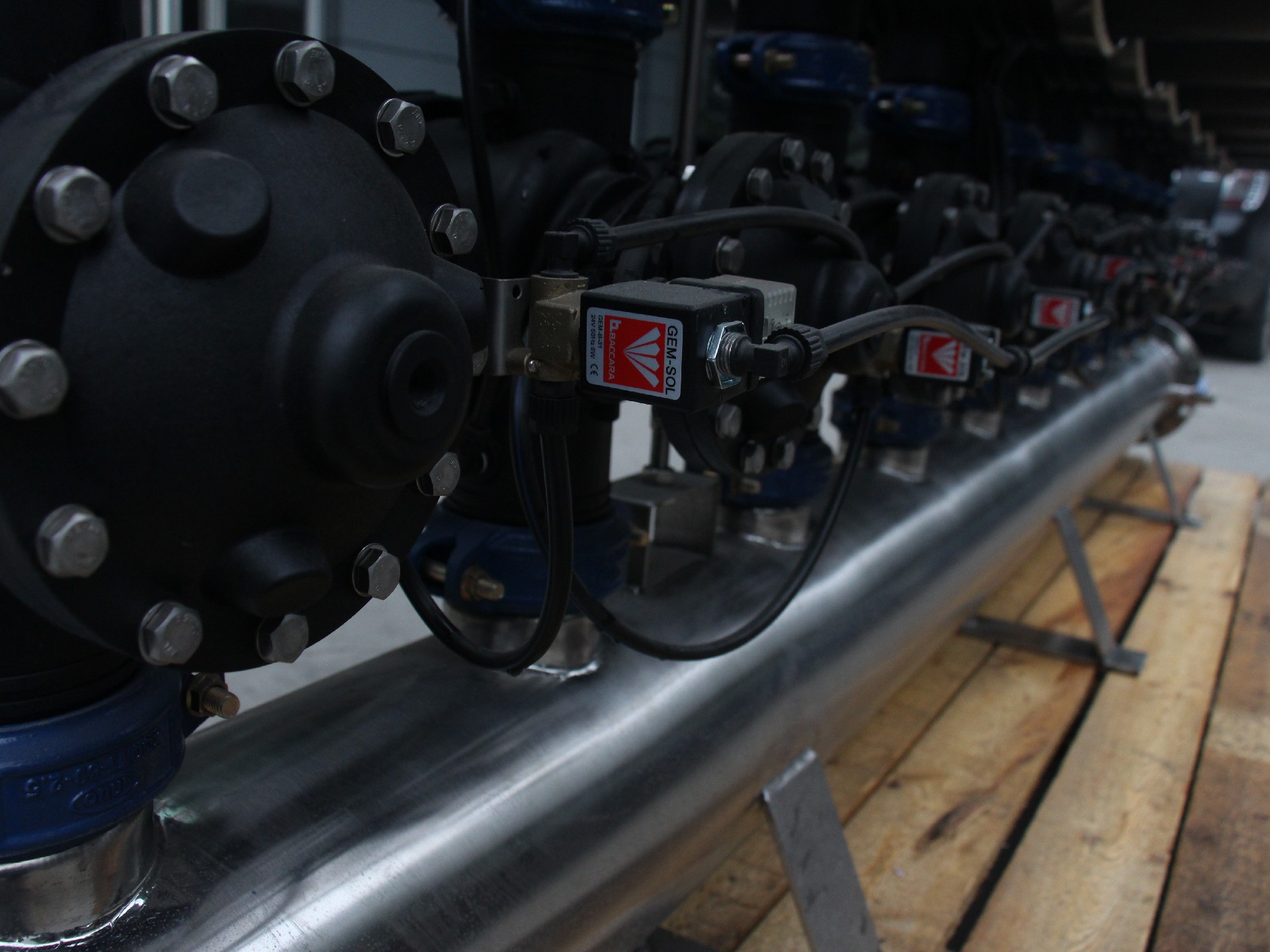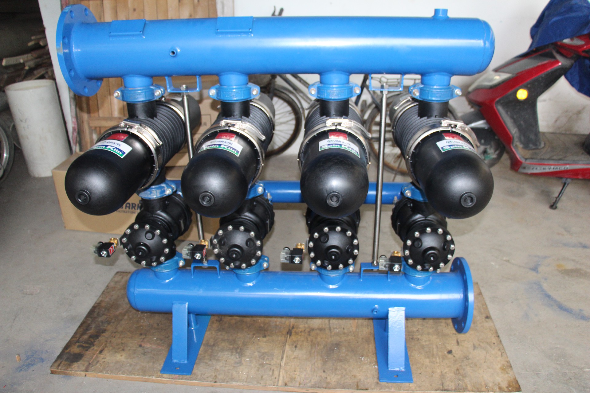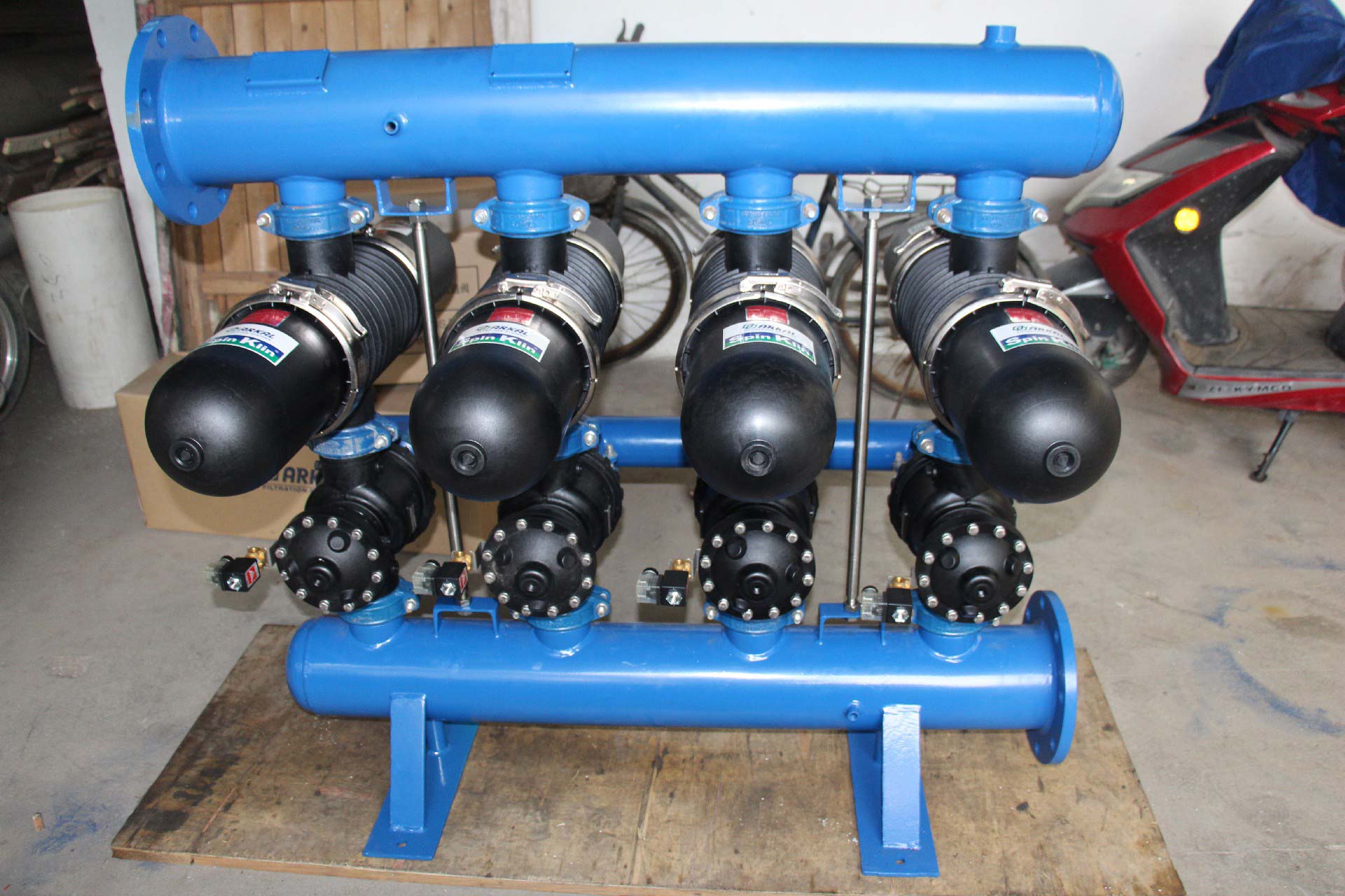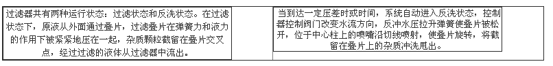 自動反沖洗過濾器是疊片式過濾器的優(yōu)點的進一步發(fā)揮,和一般疊片式過濾器的不同之出是在于它的專利設(shè)計的內(nèi)撐,一體式內(nèi)撐上有一組彈簧,一個活塞,和三組反沖噴嘴,他們配合其他控制系統(tǒng)共同作用達到高效過濾和完全反沖的功效。